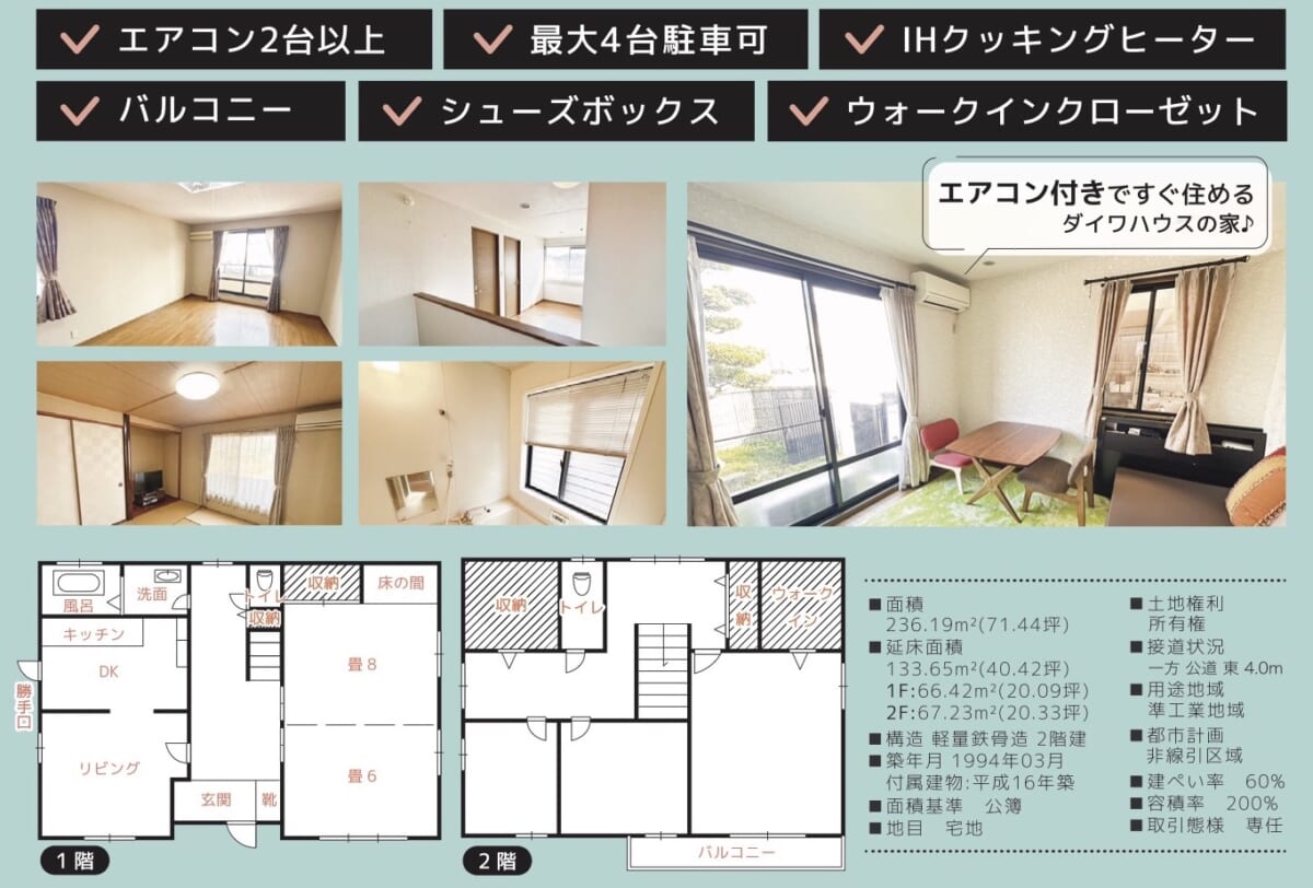 2019年外装リフォーム済み!桜の咲く土手に面した広々フリースペースあり♪ エアコン2台以上・IHクッキングヒーター・トイレ2箇所・洗面化粧台・室内洗濯機置場・可動間仕切り・ウォークインクローゼット・収納スペース・クロゼット・シューズIC、年間5,420円の負担金あり(土手の土地使用料) 、付属建物2004年築